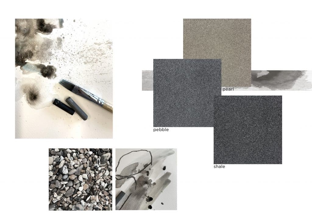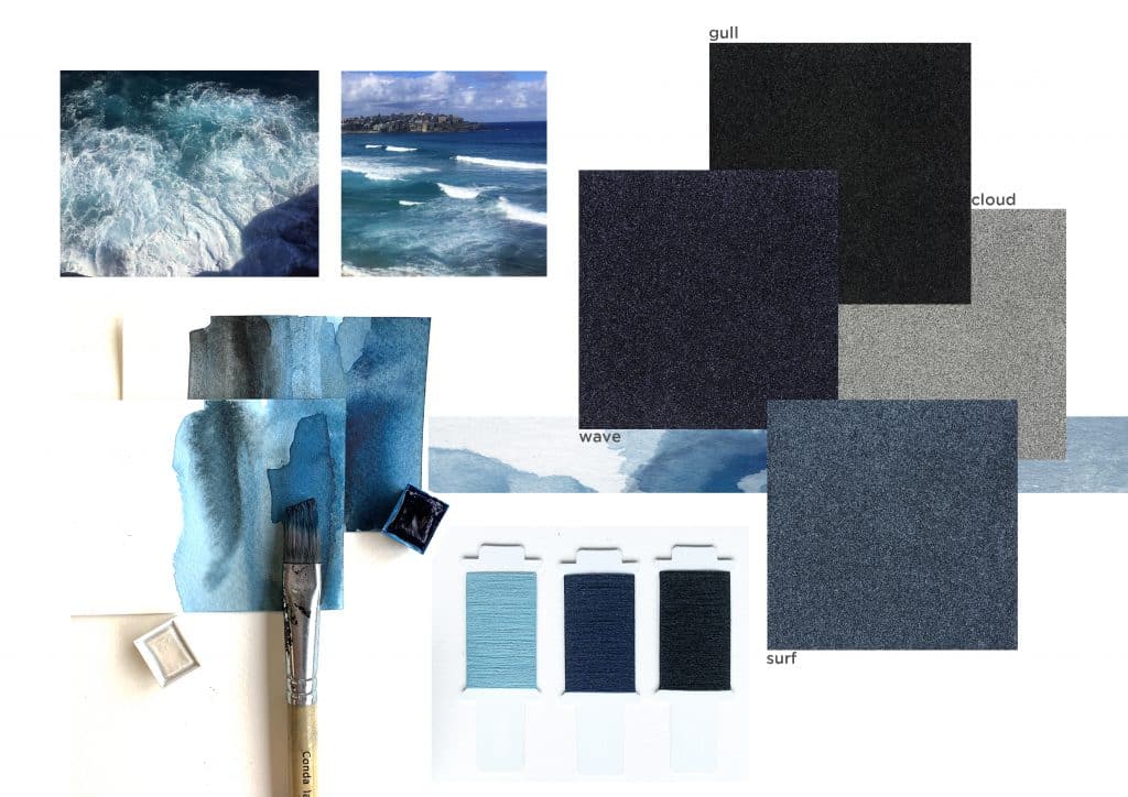 Looking to the colour names chosen, you can clearly see the oceanic inspiration. Fresh and crisp surf, deep and dramatic wave, smooth pebble and atmospheric cloud.